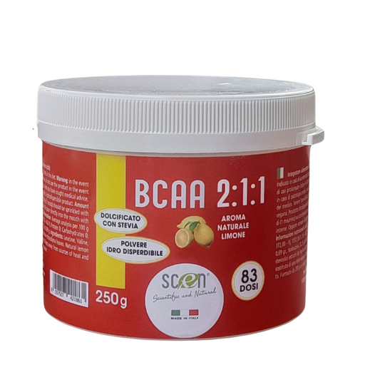 Scen BCAA 250 gr. polvere, aroma limone, dolcificati stevia, idrodisperdibili, adatto anche a VEGANI, gusto Limone