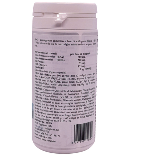 Opti3 Omega3 da alghe vegetali, vegan, senza retrogusto, 300mg EPA, 500mg DHA e 200 UI di Vitamina D3, 60 cps,